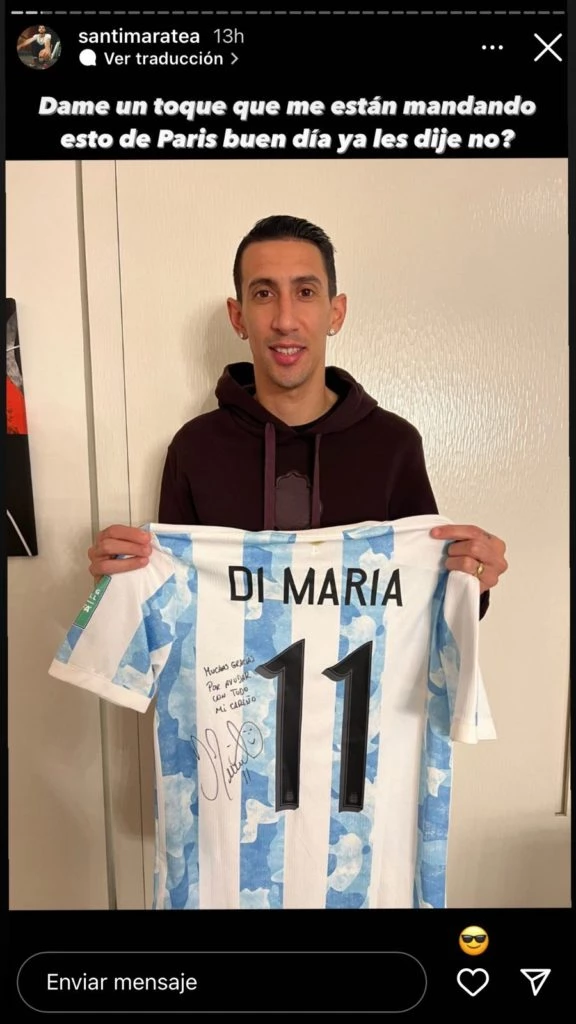 Por otra parte, Ángel Di María quiso hacer su propio aporte y se fotografió posando con la camiseta número 11, que usa en la Selección, con su apellido en la espalda y una cariñosa dedicatoria acompañada por su autógrafo.