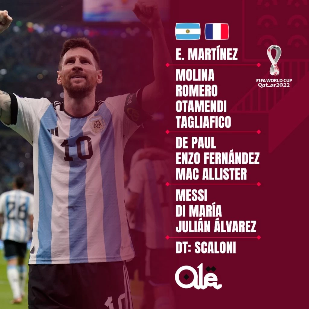 La formación de la Selección Argentina contra Francia será:: Emiliano Martínez; Nahuel Molina, Cristian Romero, Nicolás Otamendi, Nicolás Tagliafico; Rodrigo De Paul, Enzo Fernández, Alexis Mac Allister; Ángel Di María,, Julián Álvarez y Lionel Messi.