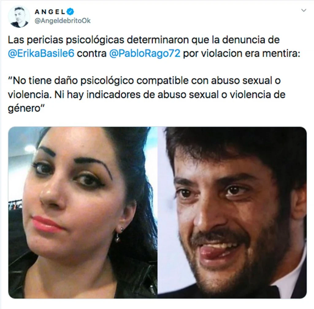 El periodista Ángel De Brito informó a través de su cuenta de Twitter que "las pericias psicológicas determinaron que la denuncia de Erika Basile contra Pablo Rago eran mentira. No tiene daño psicológico compatible con abuso sexual o violencia. Ni hay indicadores de abuso sexual o violencia de género", indicó sobre el resultado que arrojó el examen.