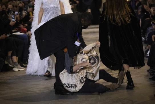 Las activistas del grupo Extinción Rebelión se infiltraron entre el staff de la reconocida marca de ropa para luego colarse a la pasarela, en el que desfilaron junto a las modelos durante casi un minuto, y desplegar una pancarta de gran tamaño que apuntaba contra el impacto del consumo excesivo de la industria de la moda en el medio ambiente.