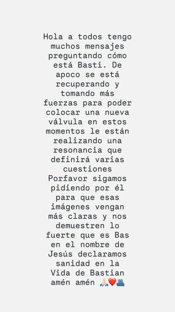 “Por favor, sigamos pidiendo por él para que esas imágenes vengan más claras y nos demuestren lo fuerte que es Bas. En el nombre de Jesús declaramos sanidad en la vida de Bastián, amén, amén”, expresó.