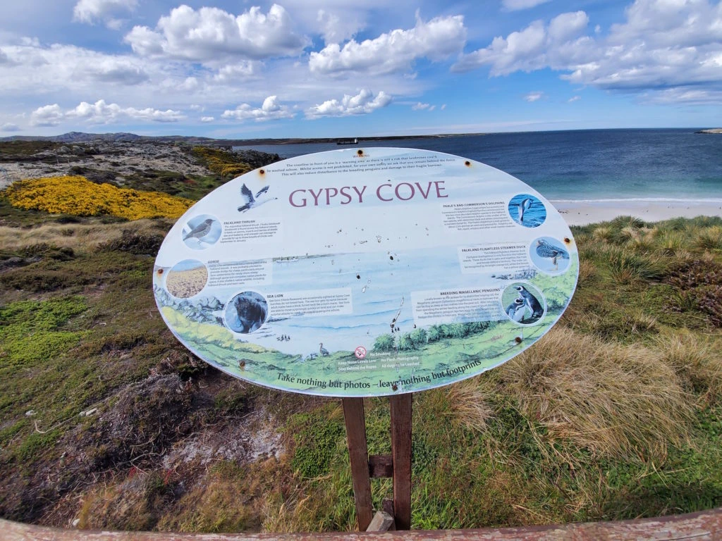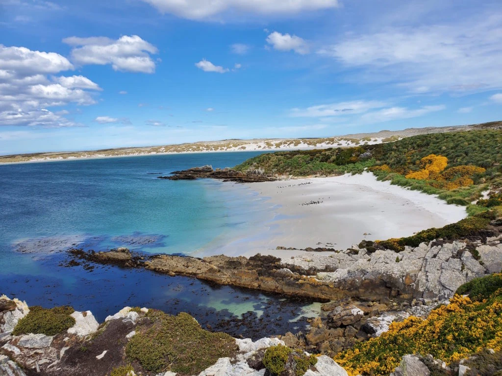 Las arenas blancas y las aguas cristalinas en una fotografía tomada justo en el momento en que el sol –algo esquivo en esas latitudes– asoma pueden confundir a algún desprevenido. El paradisíaco paisaje no es una playa del Caribe: se trata de Gypsy Cove, en la Bahía Yorke, a poco más de 5 kilómetros de la capital de las Islas Malvinas.