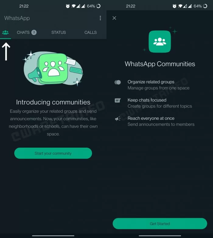 Las comunidades, son una especie de categoría donde se agrupan una serie de grupos pertenecientes a un mismo conjunto de personas, así sea de trabajo, edificios, clubes de barrios o deportivos. La diferencia está en las funciones aparte como las actividades y los eventos dentro de estos chats.