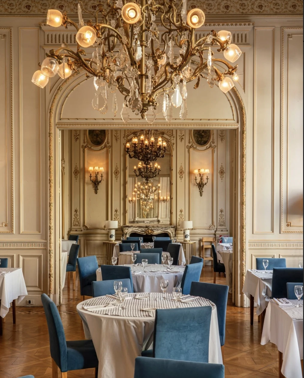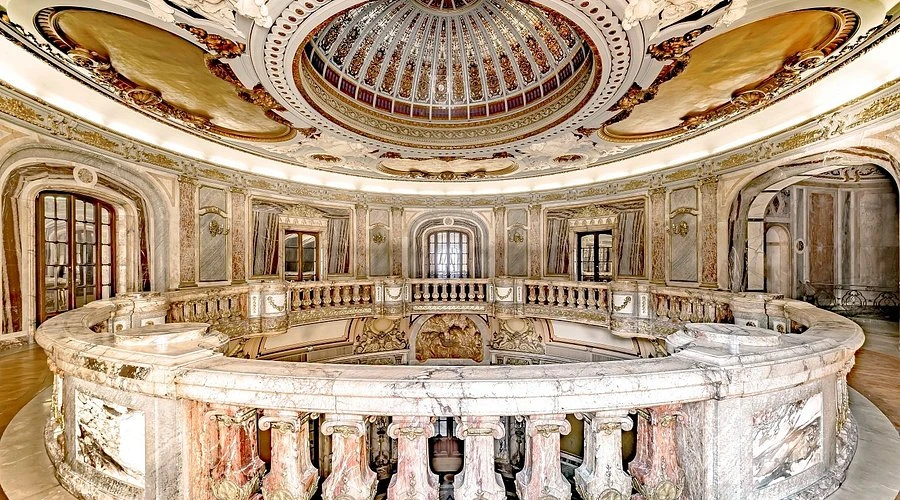 Recorrerlo es descubrir una sucesión de salones con identidad propia. El Gran Hall de Honor impacta desde el primer momento con un piso compuesto por miles de piezas de mármol colocadas una por una y una cúpula coronada por un vitral en el que aparece Luis XIV, el célebre “Rey Sol”. Más allá, el Salón de Baile evoca directamente a la Galería de los Espejos de Versalles, con arañas de cristal que parecen suspendidas en el aire sobre el parquet.