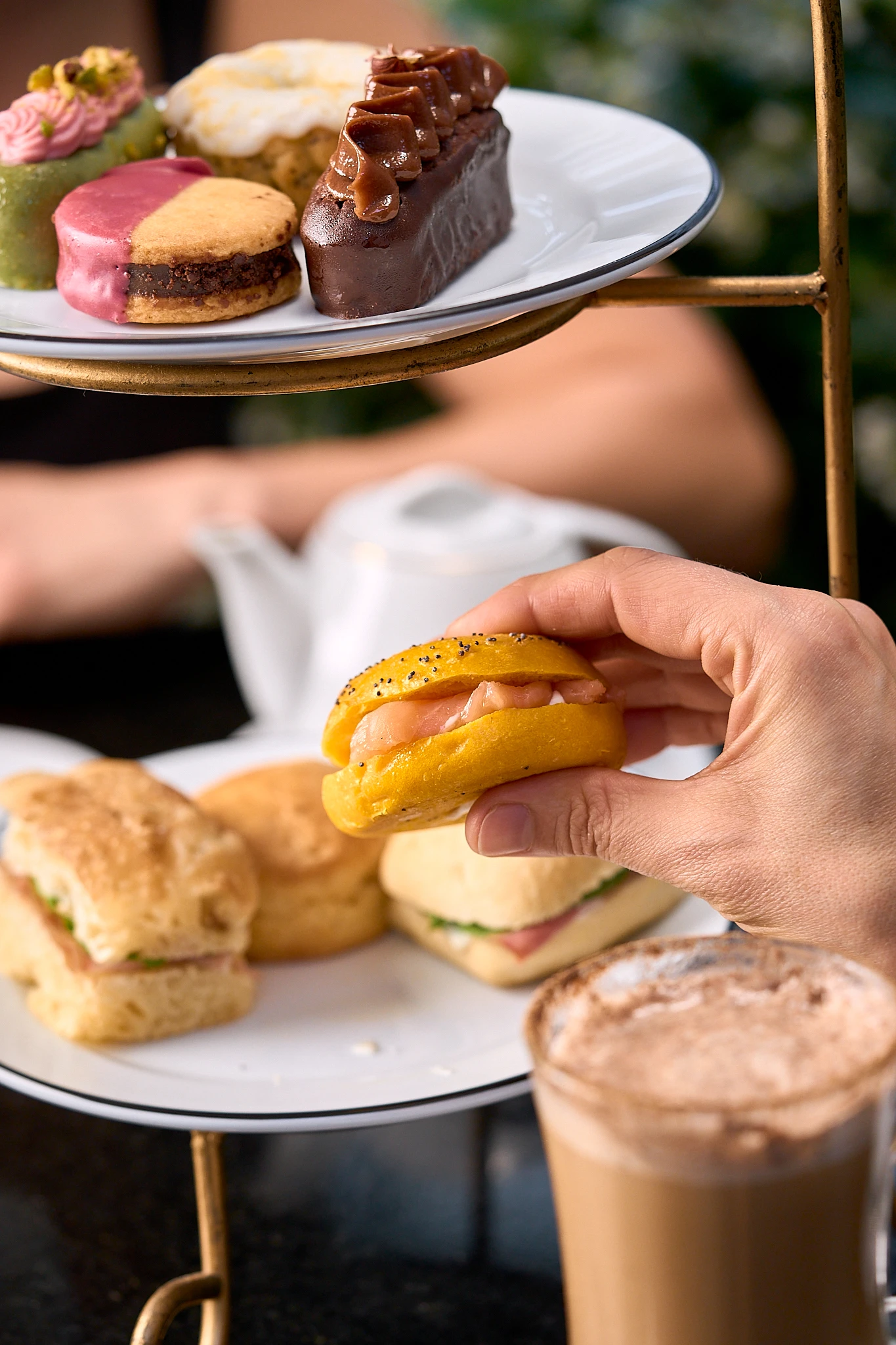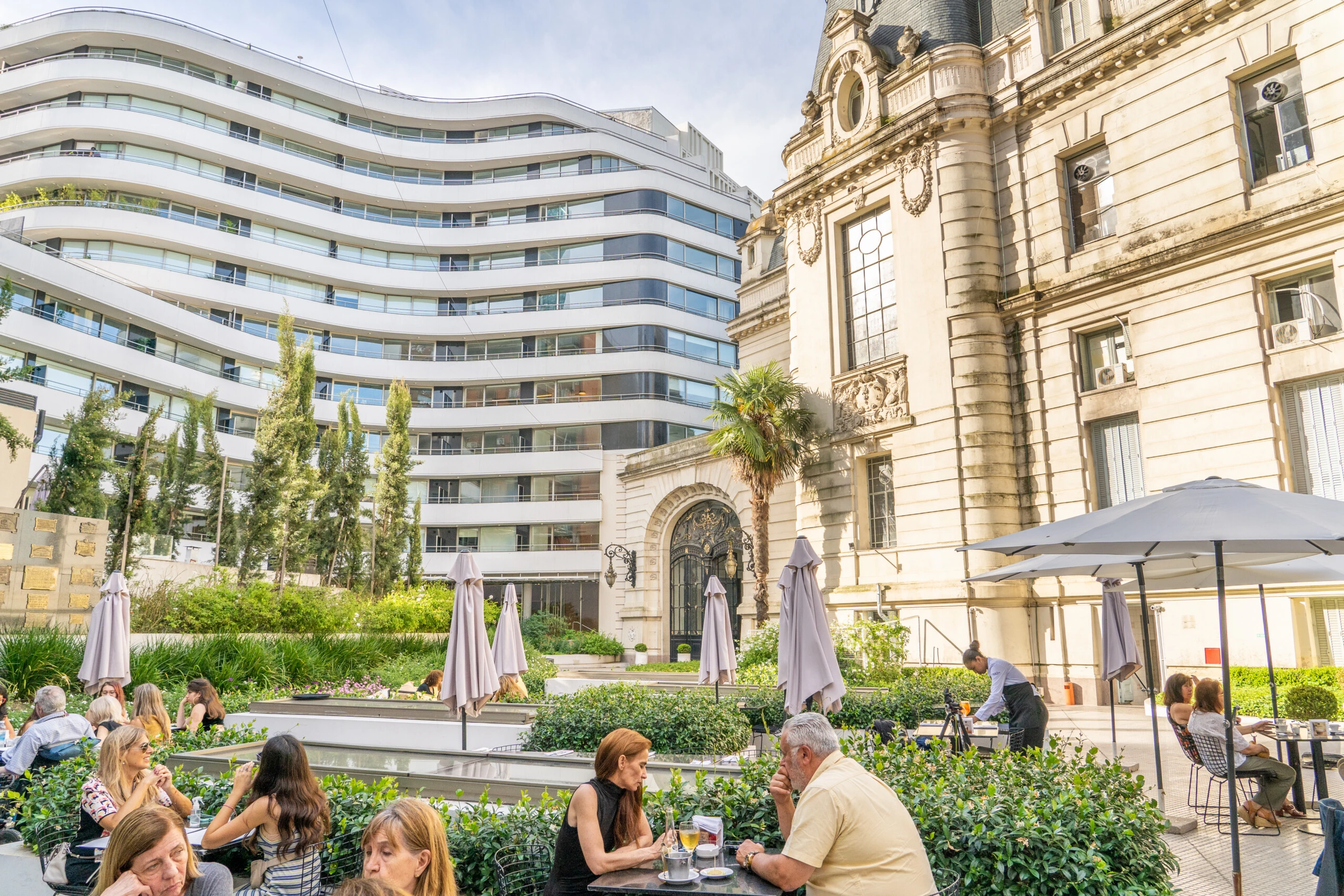 En la planta baja el jardín ofrece mesas al aire libre rodeadas de columnas, esculturas y arquitectura clásica, creando una postal que parece salida de otro siglo. Es un espacio ideal para desayunar, almorzar o simplemente hacer una pausa con café y pastelería, mientras el entorno hace el resto.