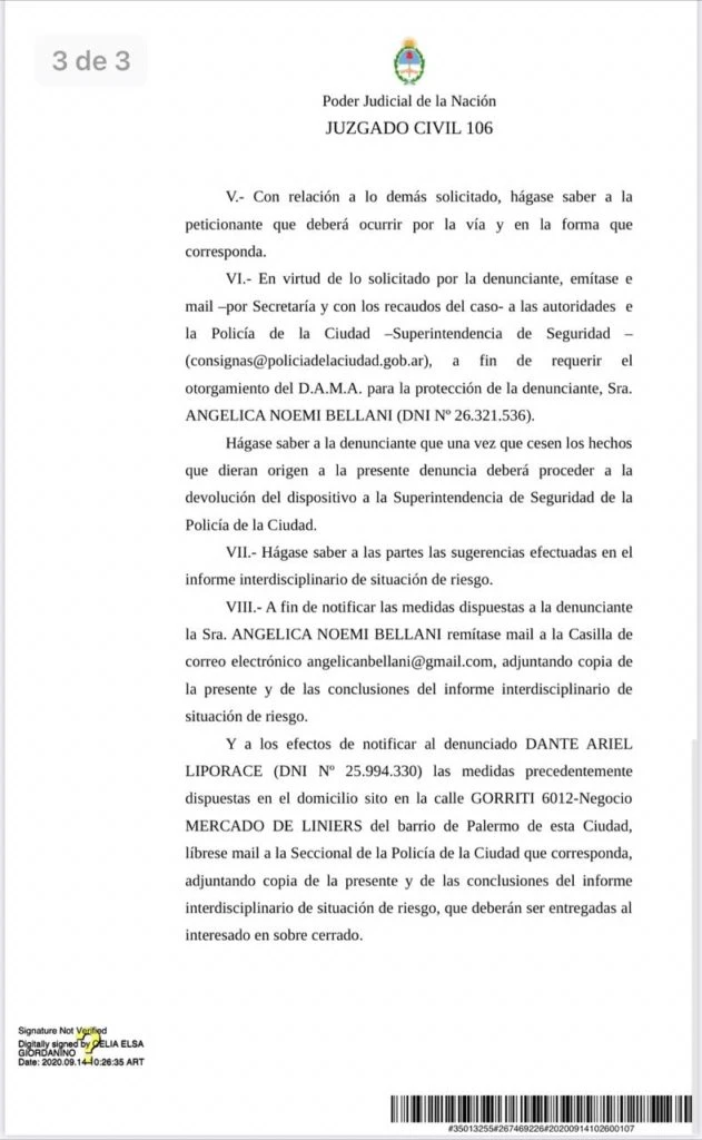"Inmediatamente le prohíben por poco mandarme una paloma mensajera ni contactarme por terceros, pero rompe la perimetral enviándome una carta documento en la que me intimaba a hacer lo que él dijera y me decía que no podía interferir con las visitas de mi hijo. Ahí toco el botón antipánico, llega la Policía, que lee ese contenido intimidatorio con el que desoyó al juez. Entonces radico otra denuncia por rompimiento de la perimetral", señala Angie quien, tras la primera mediación, que "fue muy violenta", sufrió una baja de glóbulos blancos y resistió varios dís con cuarenta grados de fiebre, hasta que le descubrieron una infección.