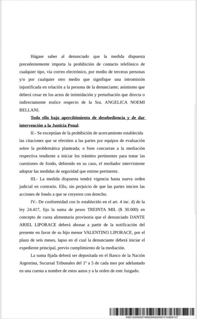 El final de su relación con Liporace se dio aproximadamente en abril de este año cuando, ya arrancada la pandemia, Liporace "empezó a hacer una doble vida". Angélica le pidió las llaves al descubrir que su por entonces pareja les decía a algunos amigos que estaban separados, y cuando se reveló el vínculo con otra mujer. "Cuando volvemos de vacaciones, un día por error me envía un audio que era para su psiquiatra, en el que decía que lo único que le importaba era gar... con otra mujer. 'Total Angie lo cuida a mi hijo'", cuenta la mujer, quien continúa con botón antipánico.