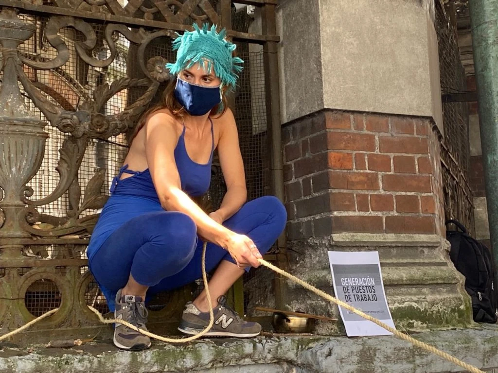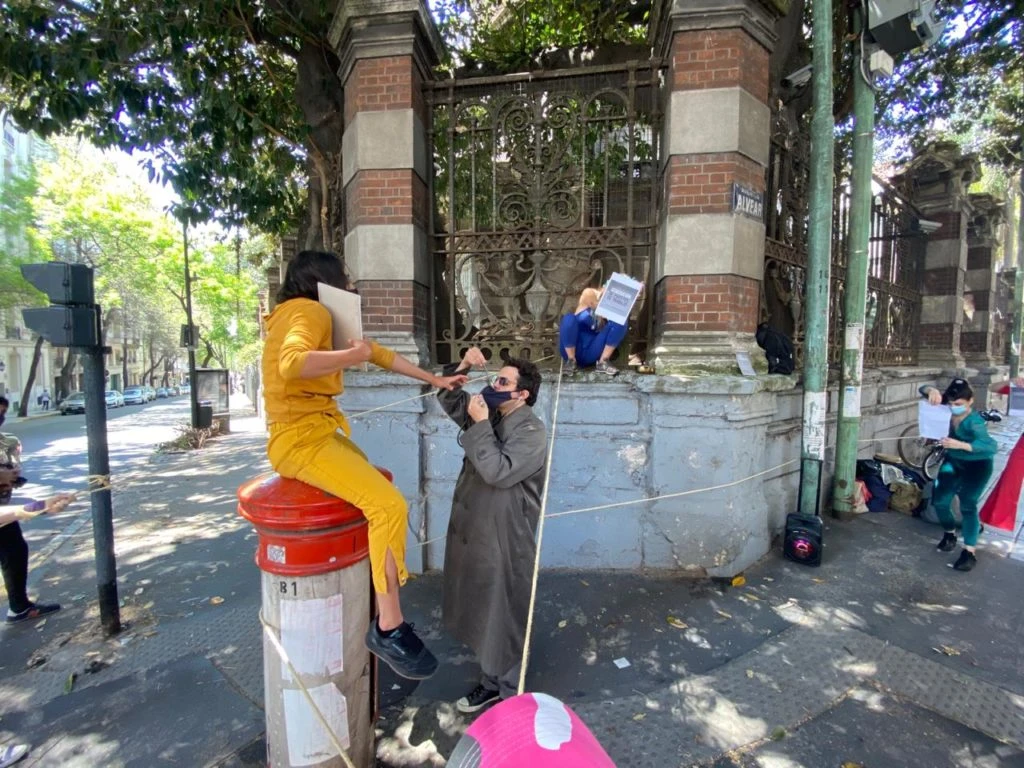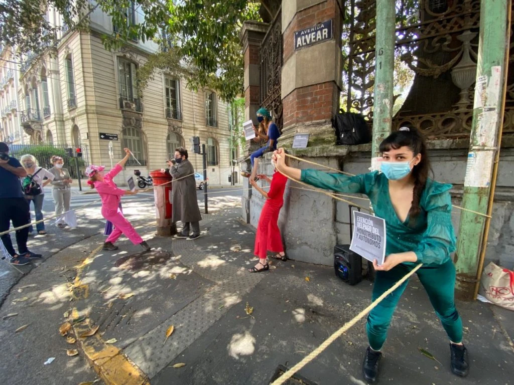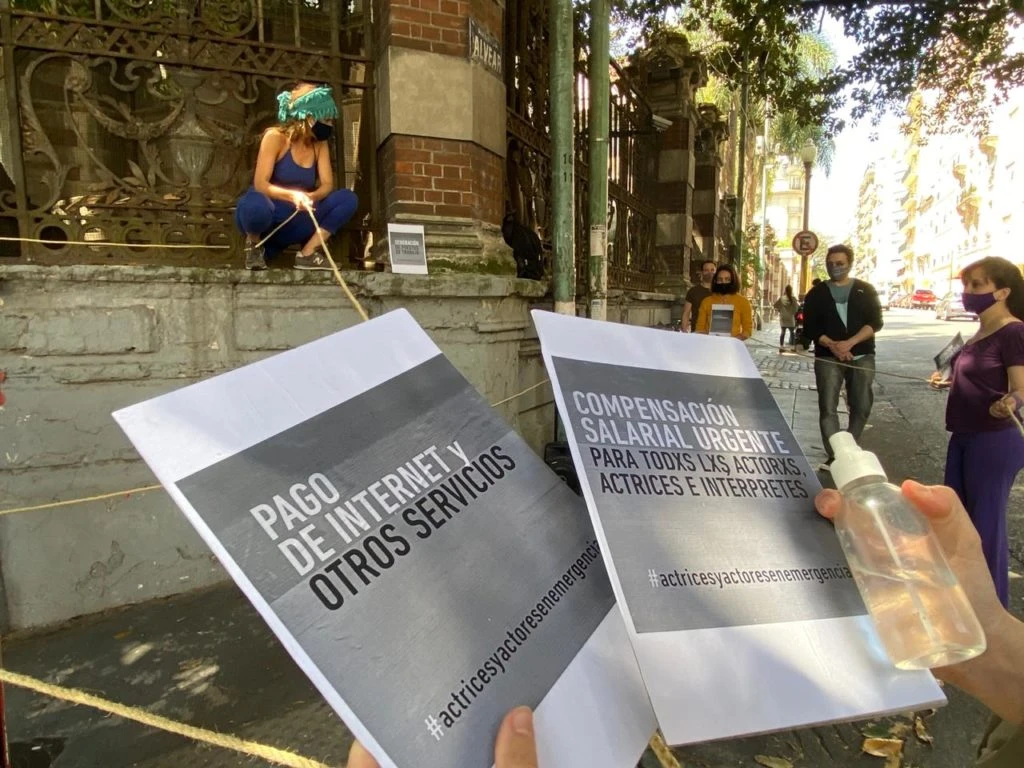 Una delegación de compañeros que actuaron en nombre de muchos de los miles de artistas que firman una carta dirigida al Gobierno, como Dolores Fonzi, Natalia Oreiro, Susana Rinaldi, Mercedes Morán, Jazmín Stuart, Celeste Cid, Laura Azcurra, Mirta Busnelli, Julieta Díaz y Nacha Guevara, entre muchos otros, hicieron una performance artística en Avenida Alvear 1690 para reclamar apoyo salarial.