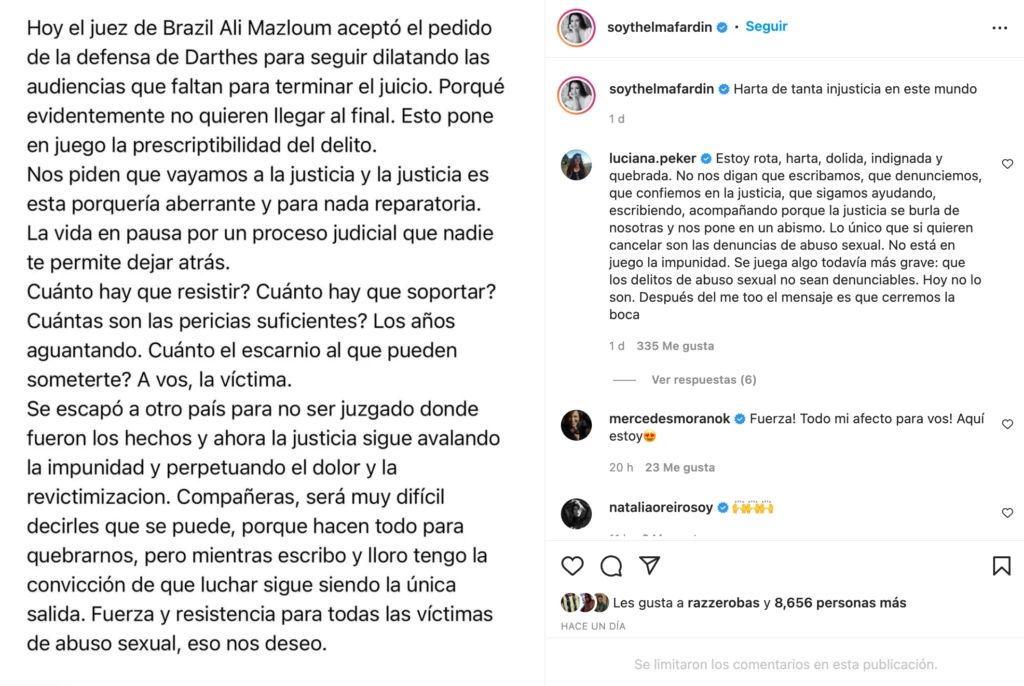 Dentro del post que realizó en su Instagram. la artista explicó a fondo la situación: “Hoy el juez de Brasil, Ali Mazloum, aceptó el pedido de la defensa de Darthés para seguir dilatando las audiencias que faltan para terminar el juicio, porque evidentemente no quieren llegar al final. Esto pone en juego la prescriptibilidad del delito”, indicó, Thelma.
