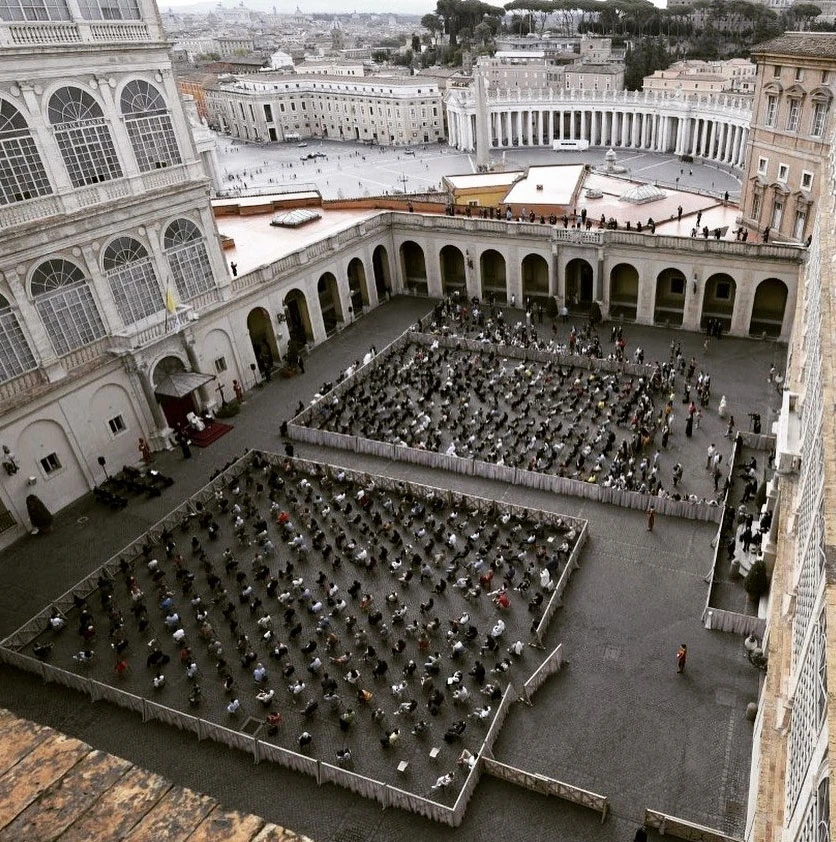 Lo hizo en un nuevo sector del Vaticano: el patio de San Dámaso, dentro del Palacio Apostólico, ante una multitud que se reunió –con distanciamiento social– para presenciar un tradicional momento que no se repetía desde hace medio año.