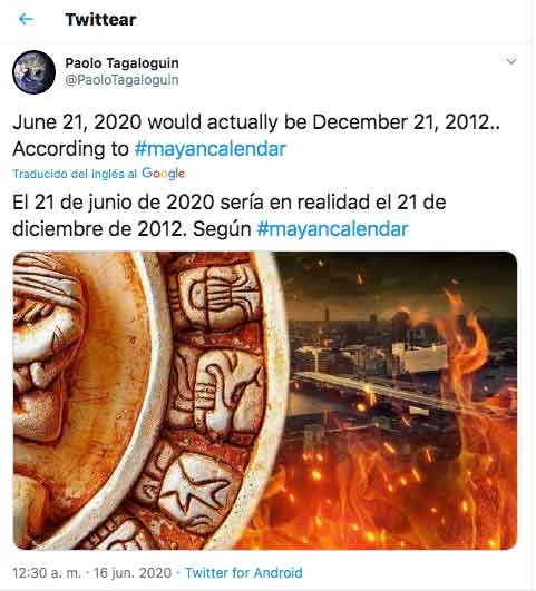 Si Tagaloguin estuviese en lo correcto, y sumando todos los días perdidos, entonces la fecha del fin del mundo, según el calendario maya, sucederá -tal lo dicho- el próximo domingo.