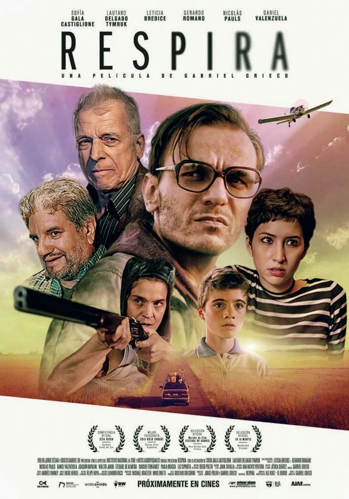 En Respira, Sofía Gala Castiglione Casanova interpreta a Leticia, una traductora de libros. “Echan del laburo a mi marido Leonardo (Lautaro Delgado), que es piloto comercial. Con nuestro hijo Manuel (Joaquín Rapalini) nos mudamos de la ciudad a una zona rural, ante la posibilidad de un puesto como fumigador de plantaciones de soja. A partir de la llegada, agárrense”, deja el tendal sobre este thriller ecológico de 78 minutos, con drama, suspenso y una guerra pueblerina de familias, producido por el propio Gabriel Grieco (a la vez guionista), Crepusculum Films, Jorge Poleri y Black-Mandala, de Australia.