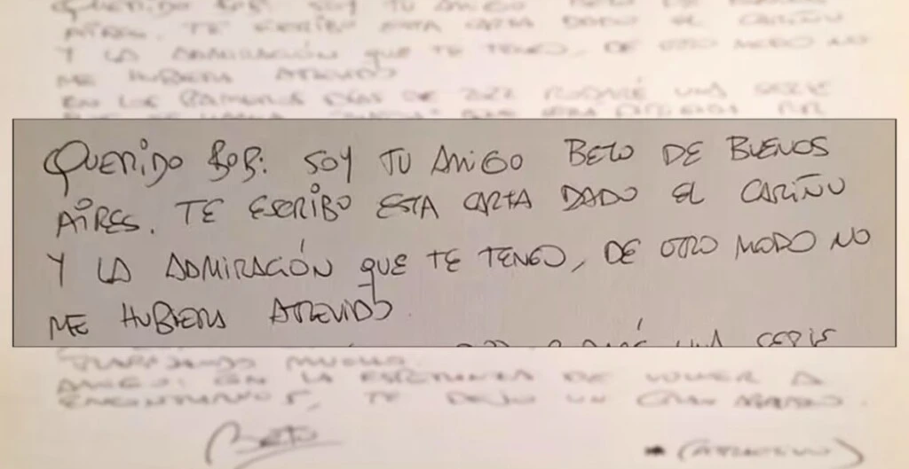 "Querido Bob: Soy tu amigo Beto de Buenos Aires. Te escribo esta carta dado el cariño y la admiración que te tengo, de otro modo no me hubiera atrevido", comienza la misiva que el actor le envió a de Niro para que se sumara a la que sería su primera serie. Allí Brandoni equivocó una letra, tachó y puso un asterisco al pie para corregirla. No la rehízo. La mandó así. Al final: "Amigo: en la esperanza de volver a encontrarnos, te dejo un gran abrazo. Beto".