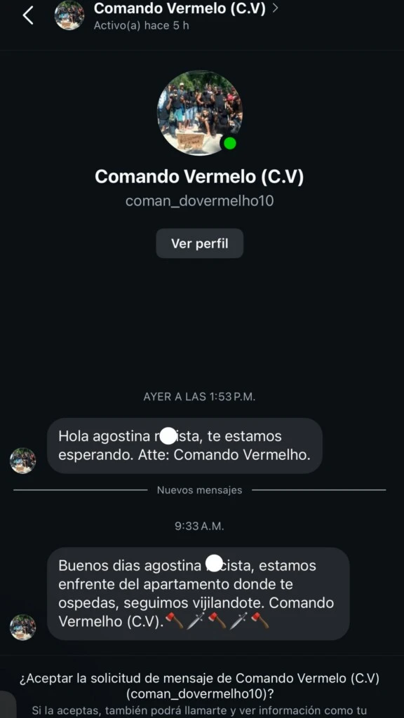 Horas después, Páez recibió un segundo mensaje desde el mismo perfil que intensificó el tono amenazante: “Buenos días agostina r***ta, estamos enfrente del apartamento donde te hospedas, seguimos vigilándote. Comando Vermelho (C.V.)”, acompañado por varios emojis de espadas y hachas.