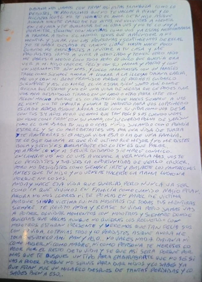 El texto siguió con una segunda parte aún más cruel, apuntada directamente a dañar: “A vos el nene no te importa y nunca te importó, para vos lo primero es la de abajo así que ahora seguí con tu vida como vos deseás, con tus 34 años, pero veremos que tan feliz sos cuando veas un nene como Fran con su mamá, con su guardapolvo de jardín como el que usaba tu hijo o veas niños jugando como podría estar él y se lo arrebataste vos por una vida de turra y te enterarás si es mejor vida esa o la de una familia, te lo dije Daiana el que ríe último ríe mejor y no me diste bola y seguiste burlándote. Eso lo tenés que pagar”.