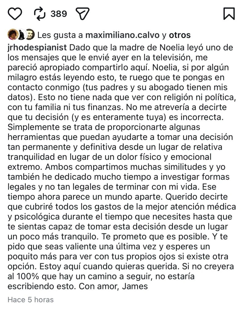 En el texto que difundió públicamente luego de que la madre de Noelia leyera parte de su contacto en televisión, Rhodes fue claro: está dispuesto a financiar “la mejor atención médica y psicológica durante el tiempo que sea necesario” para acompañarla antes de que tome una decisión irreversible.