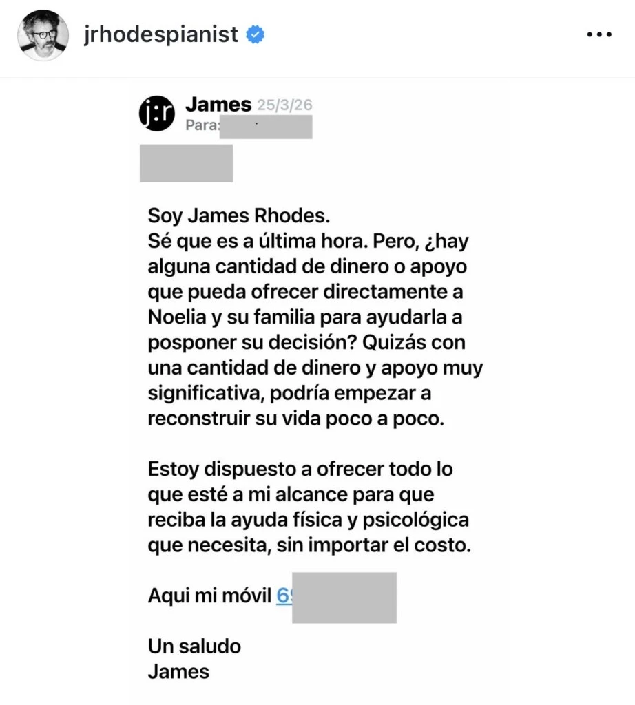 A horas de que se concrete la eutanasia programada de Noelia Castillo, la joven española que tomó la decisión de morir tras sobrevivir a una violación múltiple y con una paraplejia irreversible, se conoció la identidad de la persona que le hizo un ofrecimiento para reconstruir su vida. Se trata del pianista británico James Rhodes quien, luego de saber que la madre de la joven de 25 años había leído su mail en la televisión, dio a conocer el mensaje enviado, íntimo y urgente, que impactó en redes y medios europeos.