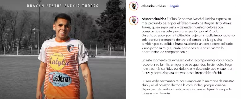 La noticia golpeó fuerte en Naschel, donde Torres era ampliamente conocido. Desde el Club Deportivo Naschel Unidos, donde dio sus primeros pasos en el fútbol, lo despidieron con un mensaje cargado de emoción.