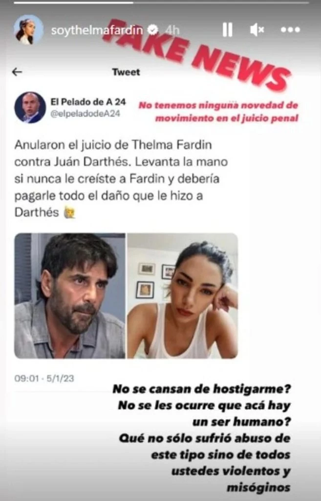 Thelma Fardín utilizó su cuenta de Instagram para desmentir la información que estuvo circulando en Twitter. Allí replicó el tuit que tenía la información falsa y aclaró: "Fake News. No tenemos ninguna novedad de movimiento en el juicio penal".