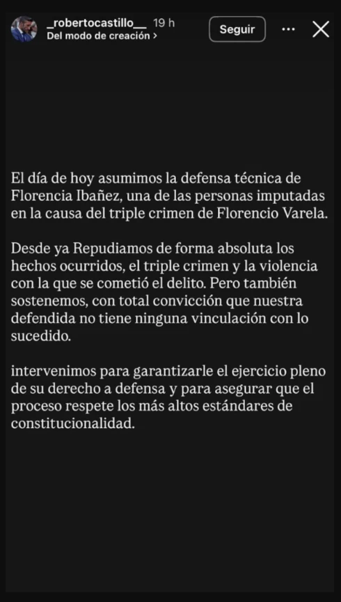 En ese contexto fue que apareció la figura de Castillo. En un comunicado difundido en sus redes sociales, el abogado anunció: “El día de hoy asumimos la defensa técnica de Florencia Ibañez, una de las personas imputadas en la causa del triple crimen de Florencio Varela”.