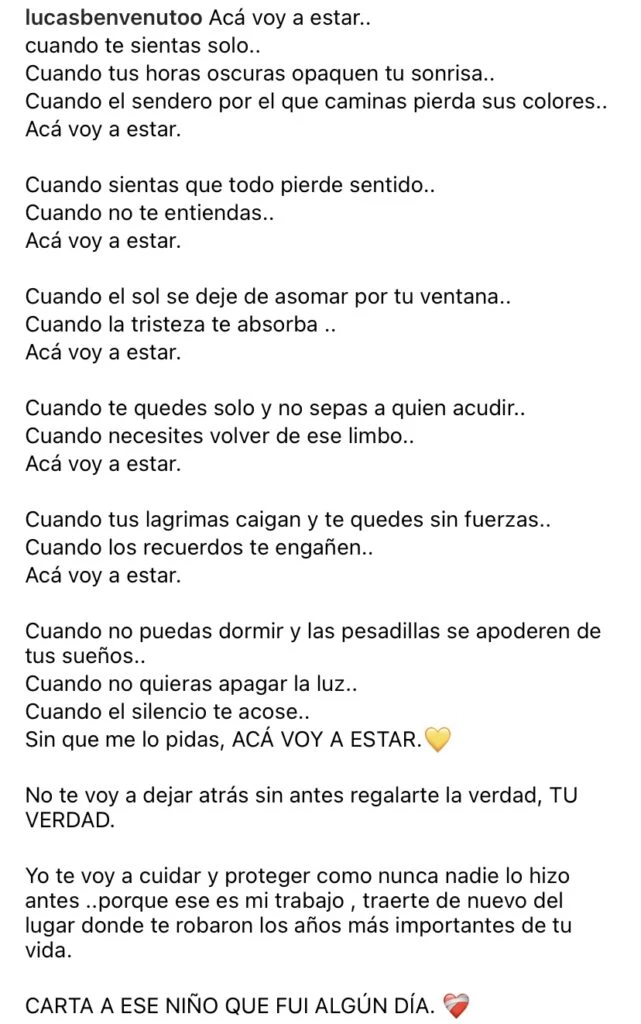 Horas después de que Jey Mammón difunda en sus redes un descargo, Lucas Benvenuto publicó una carta -acompañada por una foto de su niñez- en la que le habla al chico que fue. "Cuando no puedas dormir y las pesadillas se apoderen de tus sueños, cuando no quieras apagar la luz y cuando el silencio te acose, sin que me lo pidas, acá voy a estar. No te voy a dejar atrás sin regalarte la verdad, tu verdad", expresó.