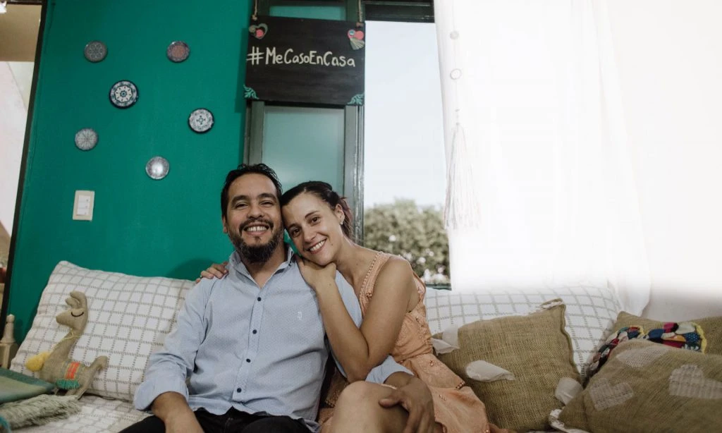 Diego y Sofía. “Nos íbamos a casar por Civil el 26 de marzo en el CPC Pueyrredón e íbamos a celebrarlo el 28 en Granja Lihuén”, arrancan contando Diego Aspitia (42) y Sofía Cuggino (32), dos cordobeses que se conocieron en un club de lectura. “Nuestra convivencia iba a arrancar después, pero estaba por salir el aislamiento obligatorio, el contrato de Sofi iba a vencer y no nos quedó opción. Así que dijimos: ‘Ya fue. Hagamos online lo mismo que teníamos pensado para la ceremonia religiosa’. Llamamos a Guillermo, el pastor de la comunidad cristiana Aviva, le explicamos lo que pasaba y él se copó con darnos la bendición online. Después, con ayuda de amigos, sacamos las fotos, creamos el Instagram @mecasoencasa y convocamos a nuestros invitados a un Zoom en el que hubo unas 40 personas, y otras 500 nos siguieron por Instagram. Duró una hora y fue hermoso, sobre todo por el cariño y el apoyo de la gente. Eso sí, la ropa que usamos fue la del Civil; la otra la guardamos para cuando podamos hacer nuestra fiesta”.