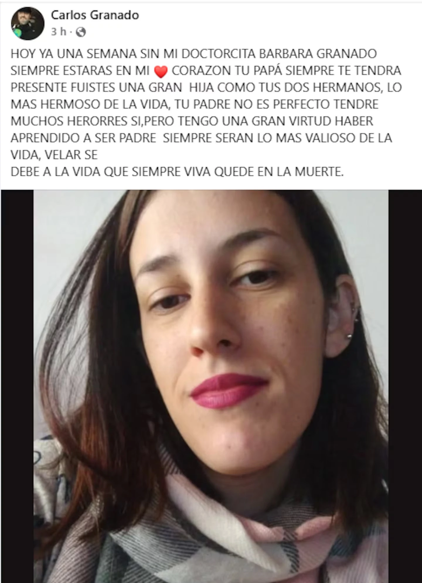 “Hoy ya una semana sin mi doctorcita Bárbara Granado, siempre estarás en mi corazón…”, escribió su padre, Carlos Granado, en un texto que rápidamente se multiplicó por la potencia de su dolor. En esa publicación, el hombre también dejó una frase que se volvió el núcleo emocional del posteo: “Siempre serán lo más valioso de la vida”, en alusión a su hija y a sus otros dos hijos. El mensaje llegó, además, después de que el propio padre hubiera sido quien confirmó públicamente la identidad de la víctima en los días posteriores al hecho, al compartir que un accidente con un colectivo se la “arrebató”.