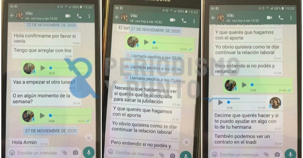 Ante esta situación, Arminda envió una carta documento que fue recibida por la ex diputada, que no envió respuesta formal pero sí se comunicó vía WhatsApp pasado un tiempo. "Le contestó con ofrecimientos de planes o contrataciones en el INADI a cambio de su renuncia", explicó el abogado.