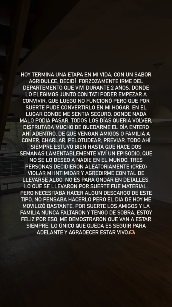 Ese espacio seguro se quebró luego de este episodio de inseguridad: “Todo ahí siempre estuvo bien hasta que hace dos semanas lamentablemente viví un episodio que no se lo deseo a nadie en el mundo. Tres personas decidieron aleatoriamente (creo) violar mi intimidad y agredirme con tal de llevarse algo. No es para ahondar en detalles. Lo que se llevaron por suerte fue material”, describió el hijo del actor y humorista.