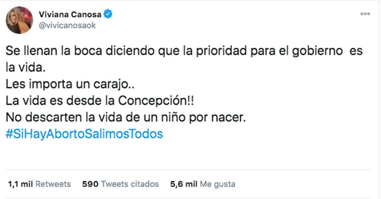 “Se llenan la boca diciendo que la prioridad para el gobierno es la vida. Les importa un carajo”, disparó furiosa Viviana Canosa en Twitter. Y agregó: "La vida es desde la Concepción!! No descarten la vida de un niño por nacer. #SiHayAbortoSalimosTodos".