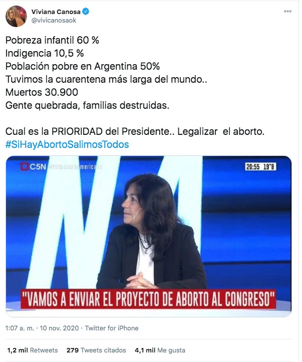 "Pobreza infantil 60%. Indigencia 10,5%. Población pobre en Argentina 50%. Tuvimos la cuarentena más larga del mundo. Muertos 30.900. Gente quebrada, familias destruidas. Cuál es la PRIORIDAD del Presidente. Legalizar el aborto. #SiHayAbortoSalimosTodos", escribió.
