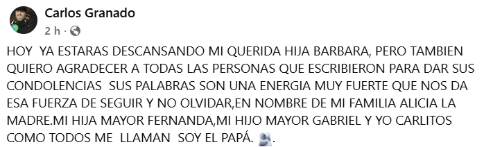 Con una entereza admirable, agradeció el apoyo recibido, ese bálsamo de energía que los ayuda a no desfallecer: "HOY YA ESTARÁS DESCANSANDO MI QUERIDA HIJA BÁRBARA, PERO TAMBIÉN QUIERO AGRADECER A TODAS LAS PERSONAS QUE ESCRIBIERON PARA DAR SUS CONDOLENCIAS, SUS PALABRAS, SON UNA ENERGÍA MUY FUERTE QUE NOS DA ESA FUERZA DE SEGUIR Y NO OLVIDAR, EN NOMBRE DE MI FAMILIA, ALICIA, LA MADRE. MI HIJA MAYOR, FERNANDA,MI HIJO MAYOR, GABRIEL, Y YO CARLITOS, COMO TODOS ME LLAMAN SOY EL PAPÁ".