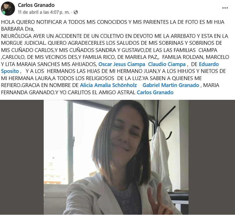 "Hola quiero notificar a todos mis conocidos y mis parientes, la de foto es mi hija Bárbara Dra.,neuróloga, ayer un accidente de un coletivo en Devoto me la arrebató y esta en la morgue judicial. Quiero agradecerles los saludos... Gracias", expresó el padre de la joven médica en un posteo que causó emoción.