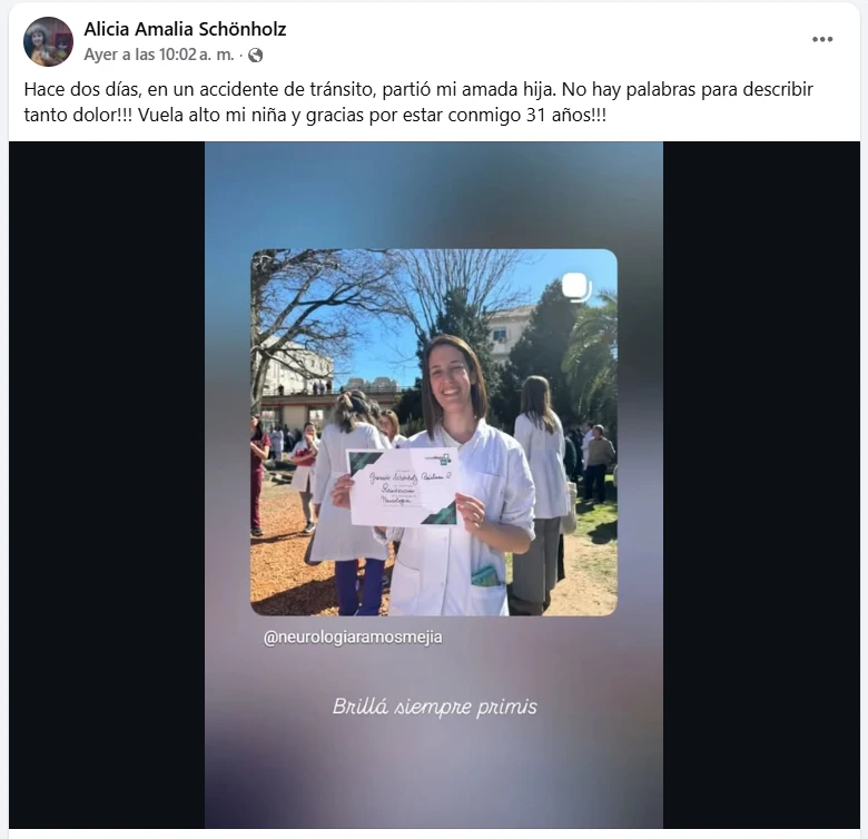 Poco después, con la herida aún abierta y el alma en pedazos, su madre, Alicia Amalia Schönholz, compartió una imagen de su hija —esa "niña" que tanto orgullo le daba— con un texto breve pero cargado de una angustia infinita: "Hace dos días, en un accidente de tránsito, partió mi amada hija. No hay palabras para describir tanto dolor!!! Vuela alto mi niña y gracias por estar conmigo 31 años!!!".