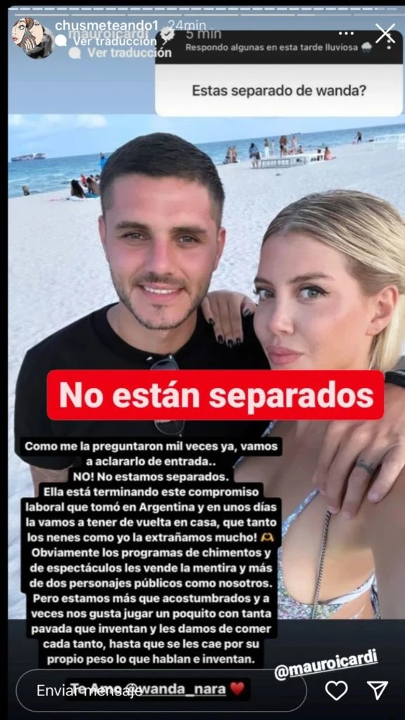 "Como me la preguntaron mil veces ya, vamos a aclararlo de entrada", comenzó diciendo un tanto enojado y añadió, "No. No estamos separados. Ella está terminando este compromiso laboral que tomó en Argentina y en unos días la vamos a tener de vuelta en casa, que tanto los nenes como yo la extrañamos mucho!".