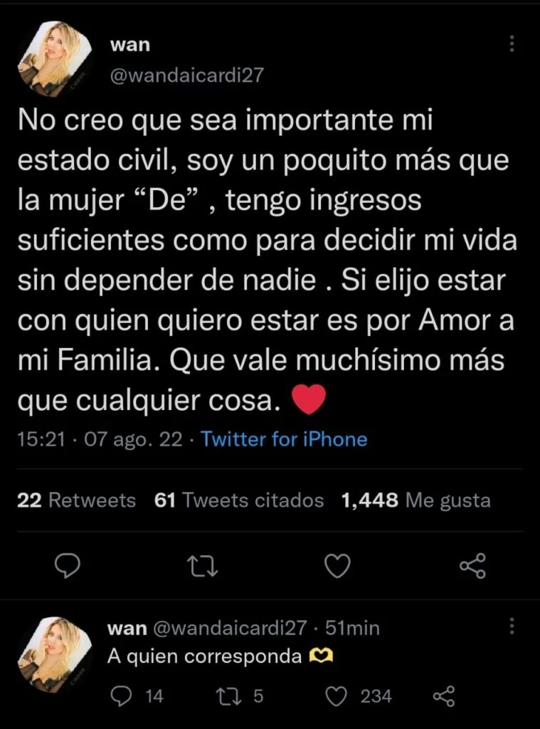 Fue entonces que un usuario le respondió, "esos ingresos los tienes gracias a haber tenido hijos con varios futbolistas". A lo que para sorpresa de todos Wanda Nara le replicó, "Sin embargo, ningún futbolista invirtió en mi empresa, provienen de mis trabajos y ahorros".