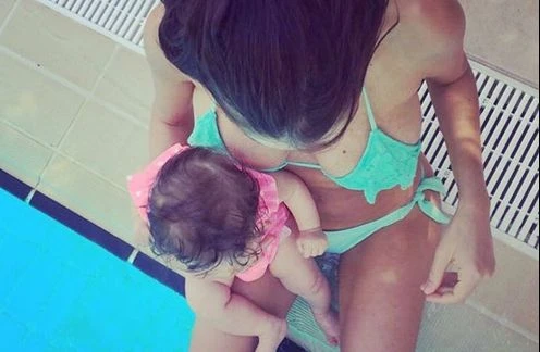"Primer chapuzón con Malaika", escribió junto a la foto en la que está al borde la piscina, con su hija en brazos y luciendo una hermosa bikini turquesa.