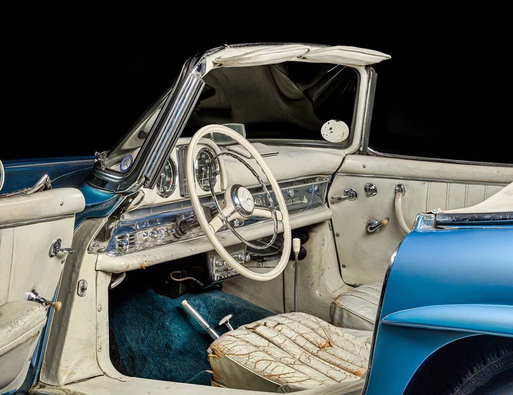 El vehículo en cuestión, un convertible deportivo biplaza, le fue obsequiado a Fangio por Mercedes-Benz en 1958, después que el piloto decidió retirarse de la competición. Con ese vehículo el balcarceño realizó un extenso viaje por Europa junto a Andrea Berruet, quien fue su pareja.