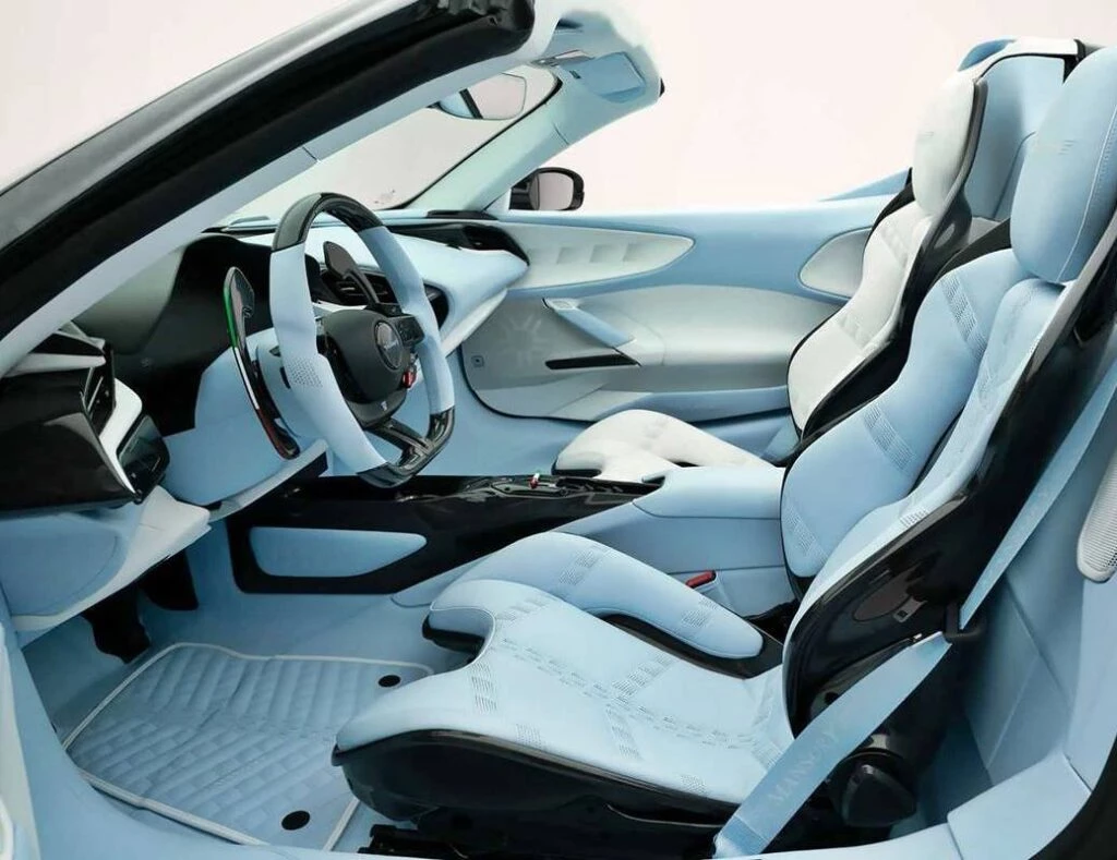 Por otro lado, el interior del F9XX Tempesta Celeste combina deportividad y elegancia con un tapizado en cuero de alta calidad en tonos azul celeste y blanco. El punto culminante visual del interior son los asientos deportivos de carbono tapizados en cuero, que crean una atmósfera excepcional que combina alta funcionalidad, elegancia y comodidad.