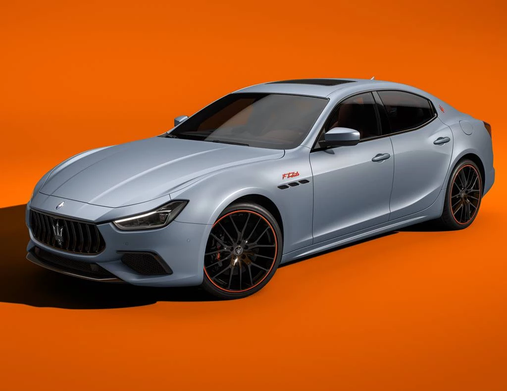 Para la carrocería en Grigio Lamiera, el color de las llantas cambia a Glossy Black, mientras que los detalles, la insignia específica y el logotipo del Tridente vienen en un naranja en contraste.