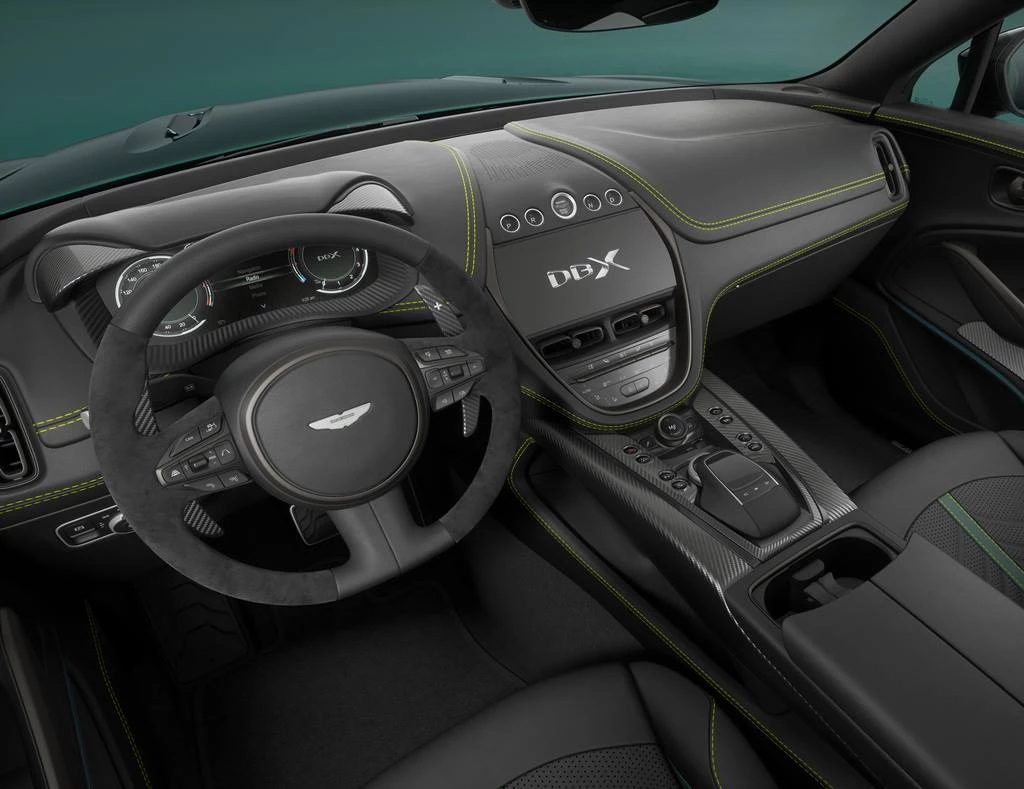 En el interior, el AMR23 Edition agrega llamativas costuras de contraste en color lima, revestimientos de fibra de carbono y satén oscuro con detalles de fibra de carbono, y el logotipo AMR23 en los umbrales de las puertas. Todo esto para dejar en claro el linaje de competición de Aston Martin.