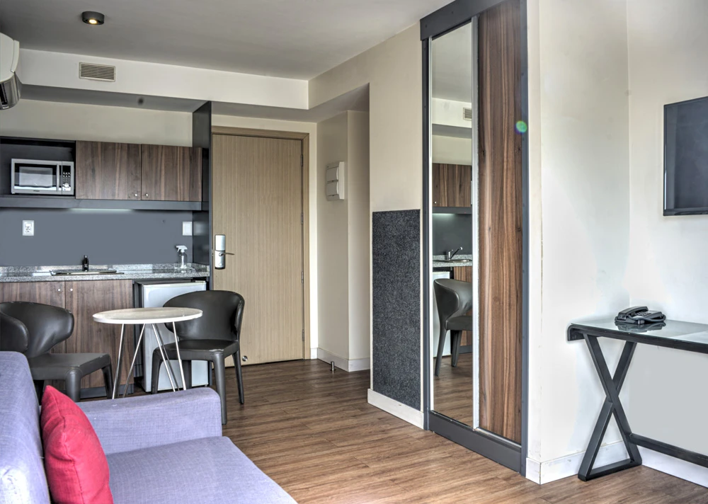 El hotel cuenta con 164 habitaciones, muchas de ellas equipadas con kitchenette para mayor comodidad. Amplios espacios y diseño contemporáneo definen este smart hotel que combina confort y eficiencia. Su propuesta incluye: