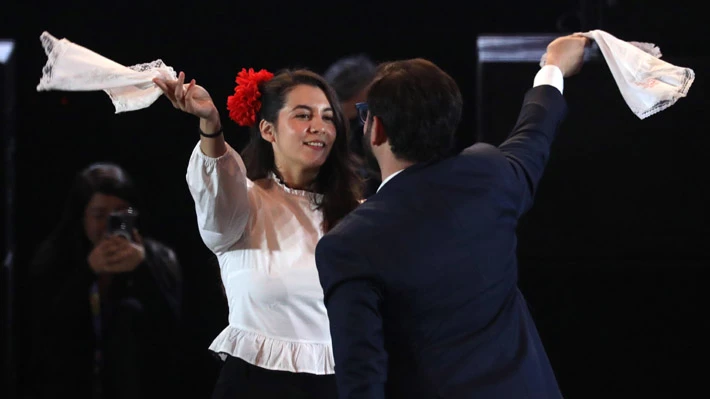 Notoriamente enamorados, uno de los momentos más esperados por el público se dio cuando Gabriel Boric bailó el pie de cueca de rigor con su pareja. Pese a que las dos primeras canciones las hizo junto a Irací Hassler y Karol Cariola respectivamente, finalmente la tercera la hizo con Paula Carrasco.