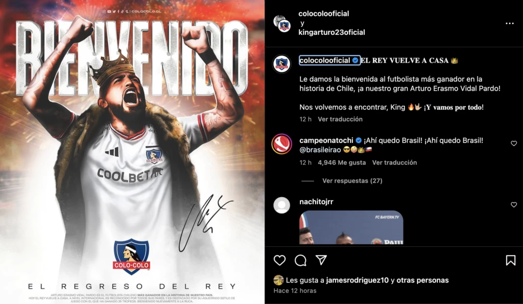 Todo comenzó a quedar más claro cuando las cuentas oficiales de Colo Colo en redes sociales lanzaron la noticia. “Empieza el juego”, se leía en un primer post del equipo, para luego lanzar la confirmación definitiva: “El Rey vuelve a casa”, con una épica imagen que hizo explotar a toda la hinchada.