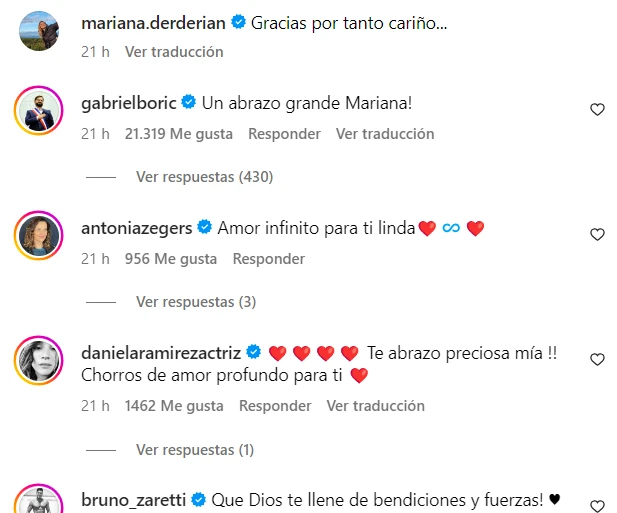 El sorpresivo y reflexivo regreso de Mariana Derderián a la vida pública derivó en miles de reacciones de afecto y apoyo de parte de los cibernautas y, por supuesto, distintas personalidades locales. Entre las que destacaron las palabras del presidente Gabriel Boric, Diana Bolocco, María Luisa Godoy, entre muchas otras.