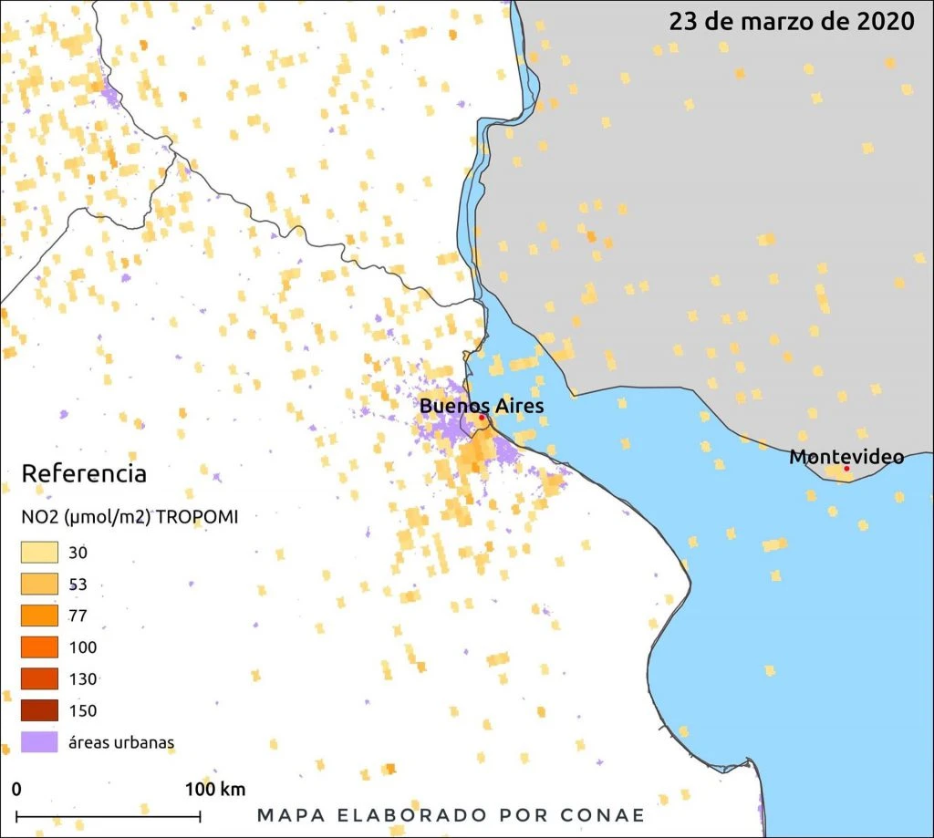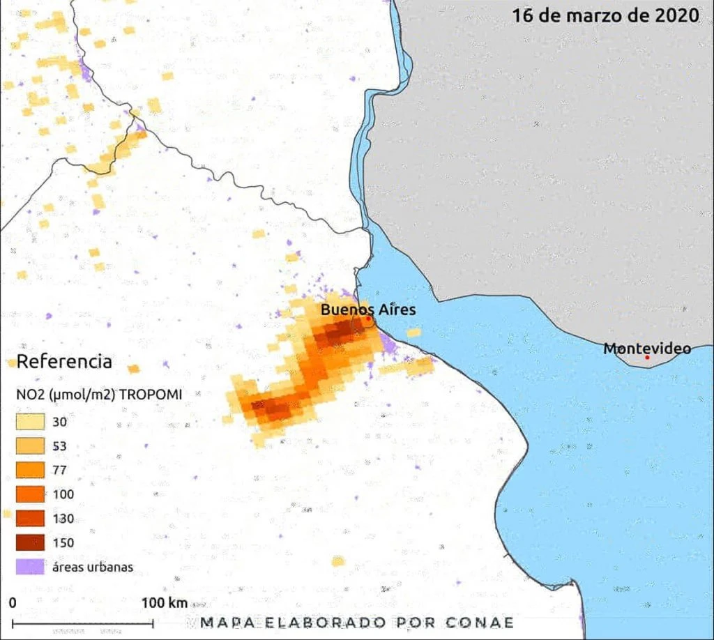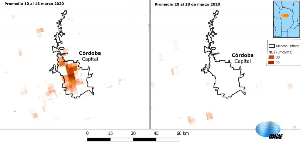 Un relevamiento realizado por la CONAE (Comisión Nacional de Actividades Espaciales) reveló que desde que comenzó el aislamiento social, preventivo y obligatorio disminuyó la cantidad de dióxido de nitrógeno (NO2) acumulada en el cielo de la Argentina, debido a que se redujo el tránsito, la actividad industrial y los vuelos (según una investigación publicada en Nature Climate Change, el turismo es responsable del ocho por ciento de las emisiones de carbono del planeta). En las imágenes satelitales –que está debajo– puede verse la comparación de días antes y durante la cuarentena en Córdoba, Ciudad de Buenos Aires y Conurbano.