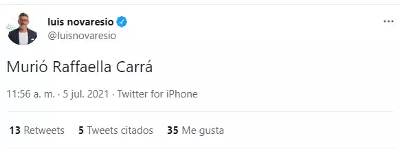 En las redes sociales, el periodista Luis Novaresio también confirmó la noticia: "Murió Raffaella Carrá", escribió el periodista en Twitter.