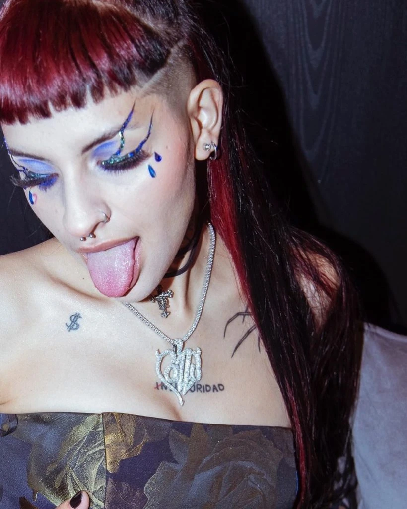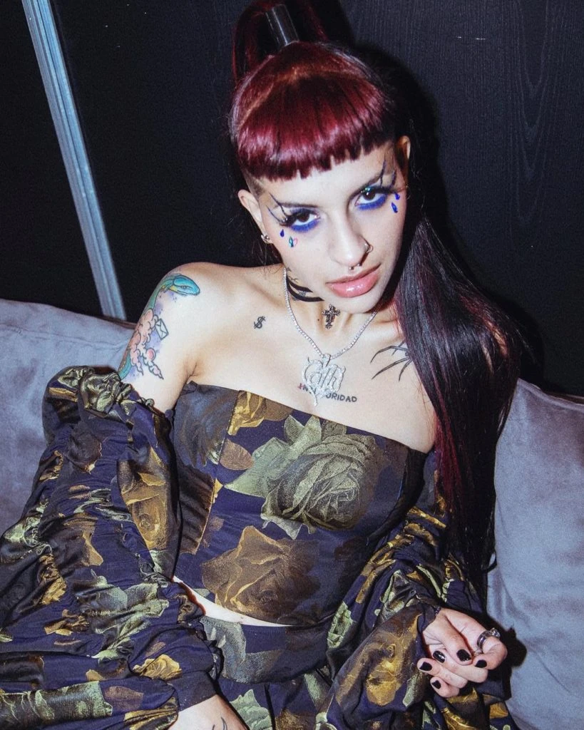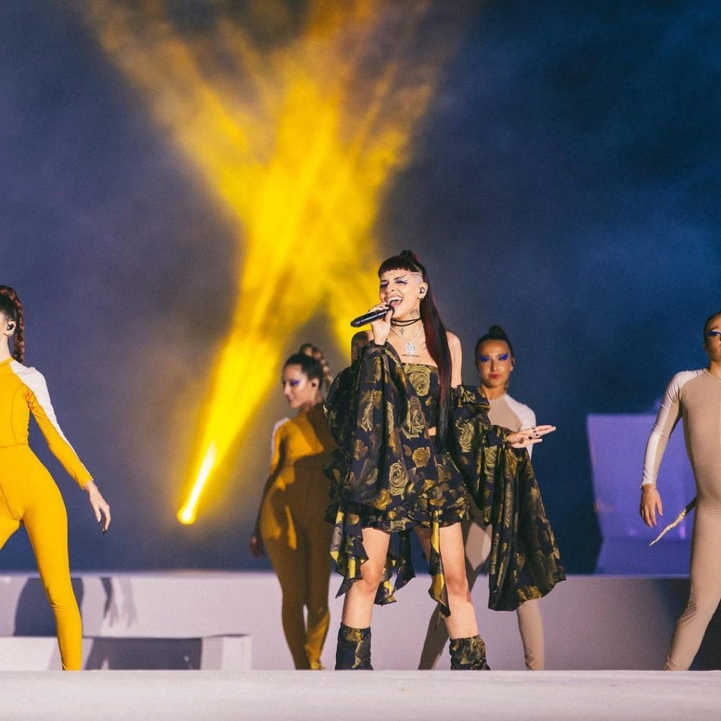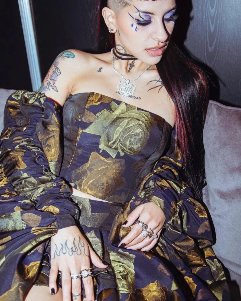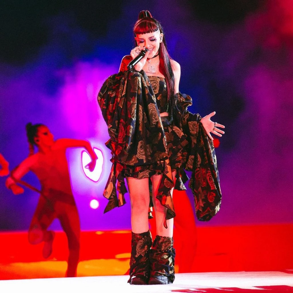 Allí, el gran cierre estuvo a cargo de Cazzu, quien cantó durante el desfile de Jazmín Chebar luciendo un make up teatral que resaltaba sus ojos en azul e incluía lágrimas dibujadas en sus mejillas.