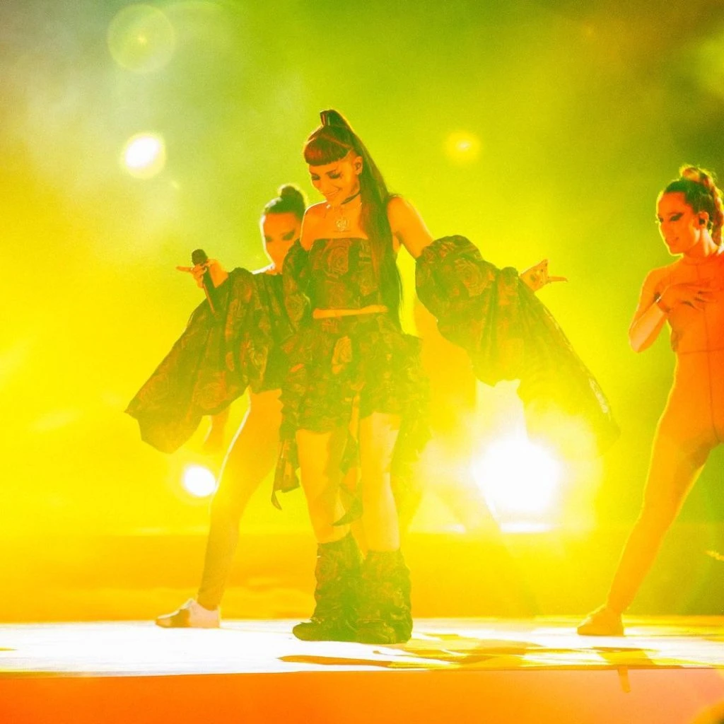 "Y le gusta sentirse mala. Tiene un todo en la sala. La imitan, no la igualan. Peligrosa como balas. Sue-sueña con los billete', ningún bobo le mete, muñequita de todo', pero de nadie juguete. Lo mueve al ritmo del clap, clap, clap, clap, clap", cantó anoche Julieta "Cazzu" Cazzucheli (27) en el mismo escenario en el que desfiló Juanita Tinelli (18).