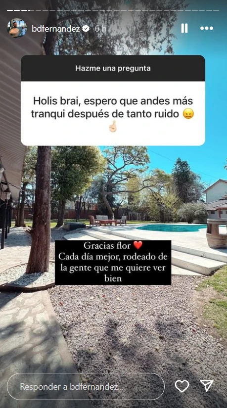 "Holis, Brai, espero que andes más tranqui después de tanto ruido" fue la primera pregunta que eligió para responder Fernández. "Gracias, Flor. Cada día mejor, rodeado de la gente que me quiere ver bien", le contestó.